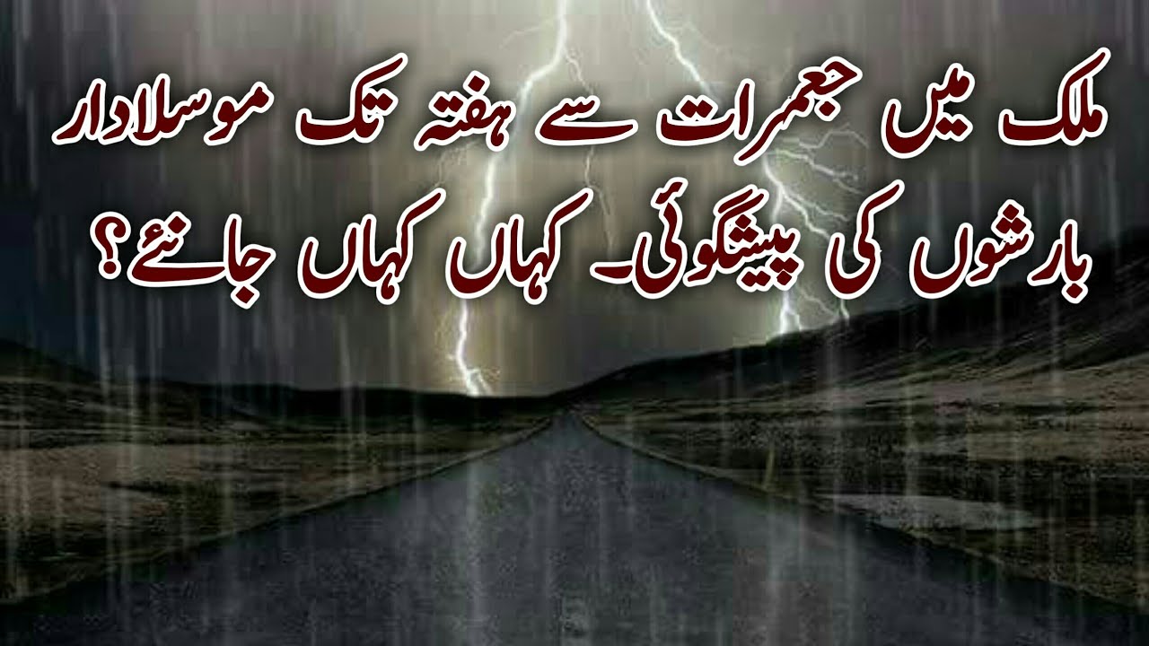 تاہم جمعرات سے ہفتہ تک بالائی شمالی وسطی اور جنوبی پنجاب میں وقفے وقفے سے کہیں تیز تو کہیں موسلادار بارشوں کی پیشگوئی۔ جس میں اسلام آباد لاہور راولپنڈی مری گجرانوالا سرگوڈا گجرات سیالکوٹ منگلا چکوال اٹک قصور جوہرآباد ساہیوال میانوالی ٹوبہ ٹیک سنگھ چیچہ وطنی اوکاڑہ پاکپتن ملتان فیصل آباد ڈی جی خان بہاولپور بہاولنگر راجنپور کوٹ ادو بکھر لیہ خانپور اور دیگر شہروں میں تیزہوائوں آندہی اور گرج چمک کے ساتھ کہیں تیز اس دوران چند مقامات پر موسلادار بارشوں سے ڈی جی خان اور کوہ سلیمان کے پہاڑی حصوں کے ندی نالوں میں شدید سیلابی صورتحال کا بھی امکان ہے۔