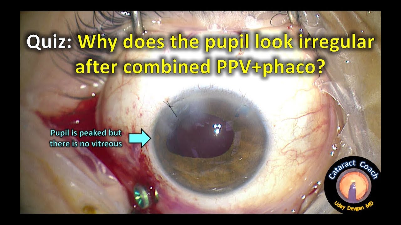 This patient is undergoing a combined cataract surgery with a pars plana vitrectomy. Two novice surgeons are operating: a senior resident is doing the phaco and IOL insertion while the retina fellow is doing the posterior segment surgery. Throughout the case, the iris behaved normally and the pupil was round. But after insertion of a three-piece IOL, the pupil looked quite peaked. The two surgeons decided to leave it alone, hoping that the pupil would return to a normal configuration after healing. That did not work.