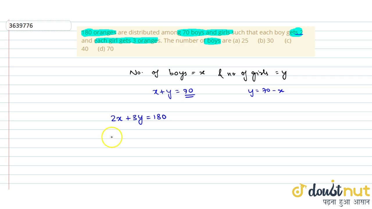 180 oranges are distributed among 70 boys and girls such that each boy gets 2 and each girl gets 3 oranges. The number of boys are (a) 25 (b) 30 (c) 40 (d) 70