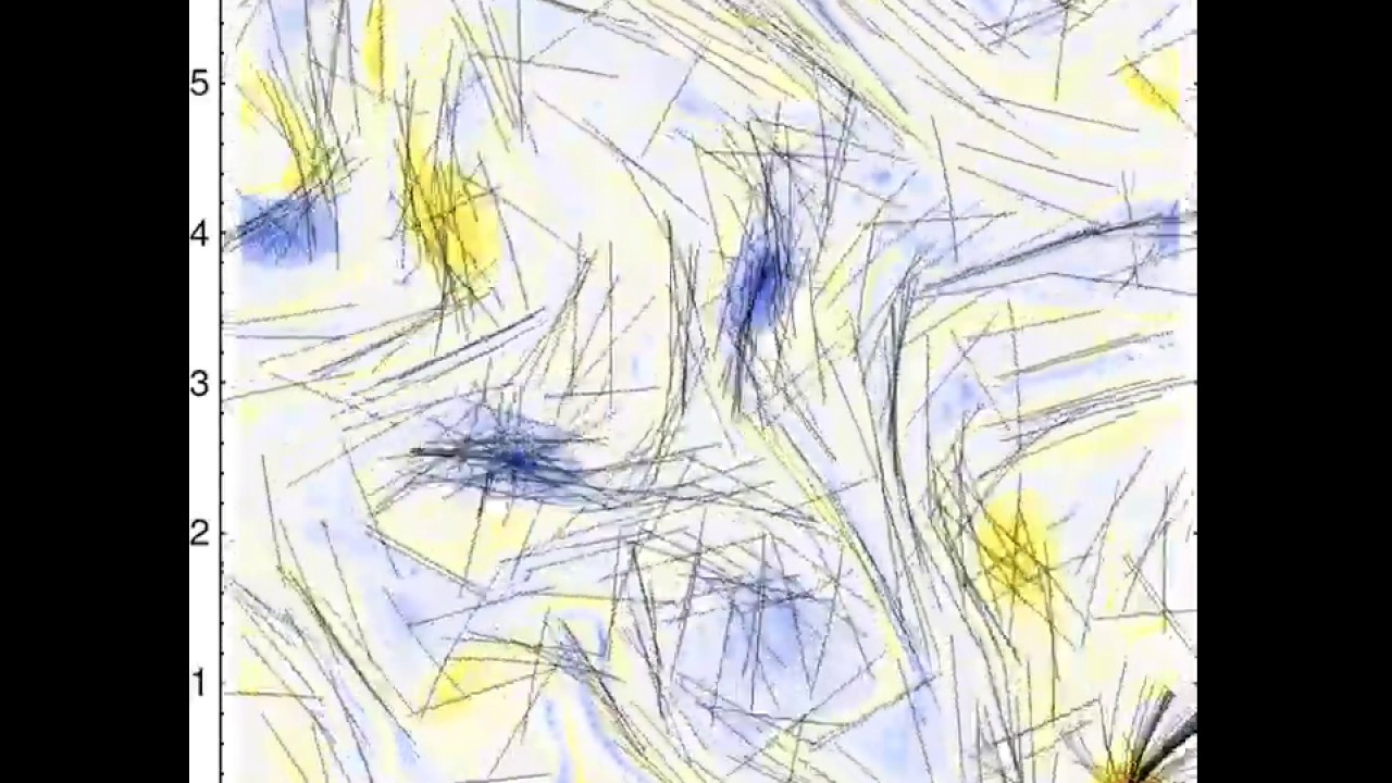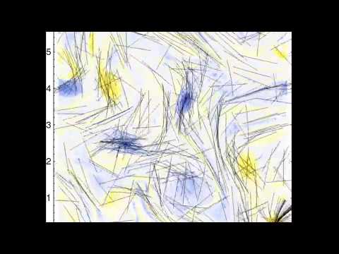 This movie visualises the dynamics of an inflexible bead-spring (inextensible) chain in a 2D turbulent flow. An ensemble of non-interacting chains (black lines) are overlaid on a pseudo-color plot of the vorticity field. The bending stiffness of the chain prevents it from being entrapped within vortices and, thus, reduces the extent of preferential sampling of vortical regions in comparison with a flexible chain. See also: